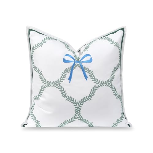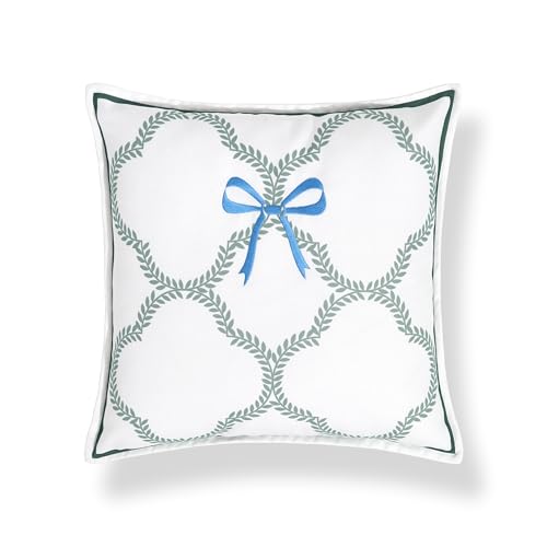 - Refined Coastal Design: Showcasing fresh green leaf motifs on a pristine white canvas, this pillow cover is beautifully accented with an azure blue embroidered bow. The flanged border detail adds sophistication, while the solid white back ensures timeless appeal.