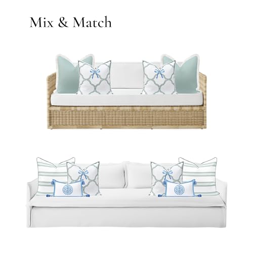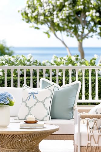 Hofdeco Premium Coastal Grandmillennial Patio Indoor Outdoor Throw Pillow Cover Only, 20"x20" Water Repellent for Backyard, Couch, Poolside, Celadon Baby Blue Embroidered Ribbon Bow Tie on Leaves